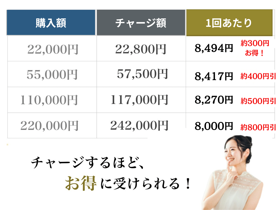 まとめてご入金いただく方法で、かなりお得に通えます。継続して通う方にはおすすめです。(チャージ金額は以下のようになっています。)